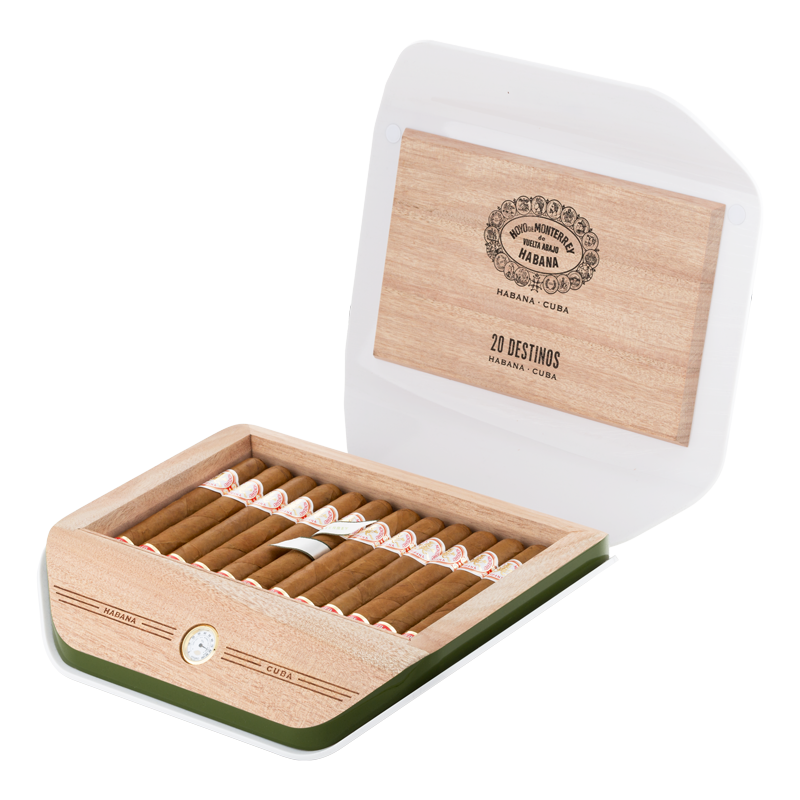 El Hoyo de Monterrey Destinos es una vitola muy particular y codiciada, diseñada específicamente para el canal Travel Retail (Tiendas Duty Free de aeropuertos y cruceros), lo que lo convierte en un Habano exclusivo y un objeto de deseo para coleccionistas y viajeros. Este cigarro encarna la esencia de Hoyo de Monterrey: fortaleza suave a media, un perfil aromático delicado y una fumada cremosa. Su presentación en un elegante humidor de viaje lo hace perfecto para llevar consigo y disfrutar de la experiencia cubana en cualquier rincón del mundo.